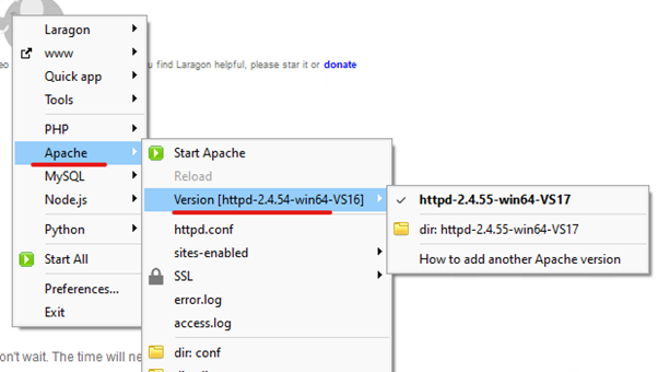 Svaki put kad dođe nova Apache verzija, napravite isti postupak – staviti u C:\laragon\bin\apache folder, u izborniku odabrati verziju i napraviti restart Apache-a.