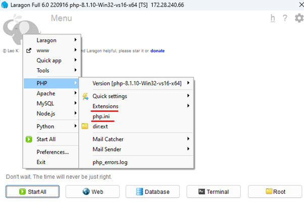 - Desni klik bilo gdje unutar Laragon prozora > PHP > php.ini