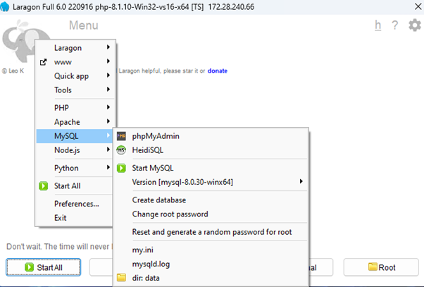 desni klik unutar Laragon prozora > MySQL > phpMyAdmin