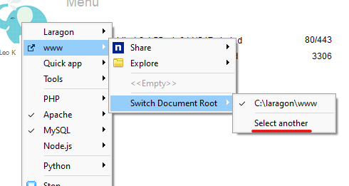 desni klik bilo gdje unutar Laragon prozora > www > Switch Document Root i odabrati novu mapu.