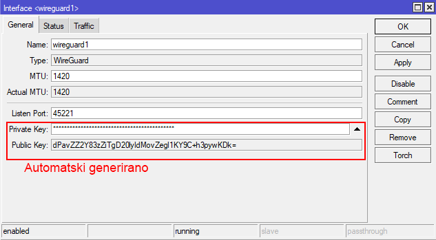 - PublicKey: javni ključ od Mikrotik Wireguard interface-a kojeg smo generirali gore u prvom koraku, navesti ga ovdje