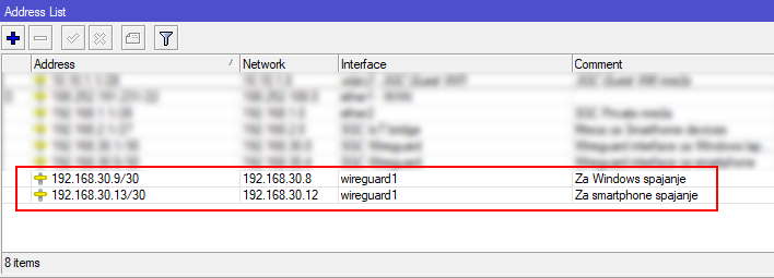 - navesti adresu koja se smije spajati u Wireguard tunel. Adresa mora biti jedinstvena, ako ste koristili subnet masku /30 onda drugu adresu iz tog segmenta