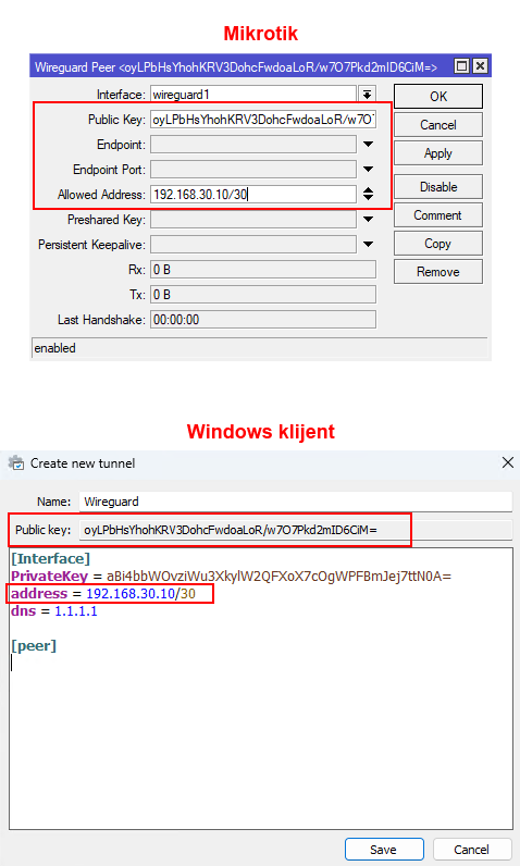Dakle, svaka strana koja sudjeluje u kreiranju Wireguard tunela mora imati svoje network interface postavke i svoje peer postavke. Zato jer time svaka strana generira svoj privatni i javni ključ čime stvaraju sigurnu vezu za razmjenu prometa.