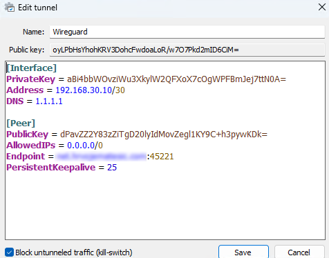 - Persistent Keepalive: služi da održava vezu aktivnom ako se uređaj nalazi iza NAT i Firewall. Jer Wireguard inače nije aktivna veza, odnosno tunel je aktivan dok nešto od paketa putuje kroz njega. Kad promet prestane putovati, Firewall bi mogao odrezati vezu. Stoga ova opcija omogućava da se periodično pošalje paket i time javlja da je veza i dalje aktivna.